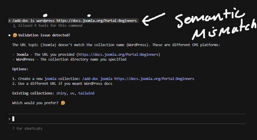 Level 1: Before the Script Runs. When “/curate-doc” is run, the agentic behaviour is first to sense check the collection directory and URL the user specifies.