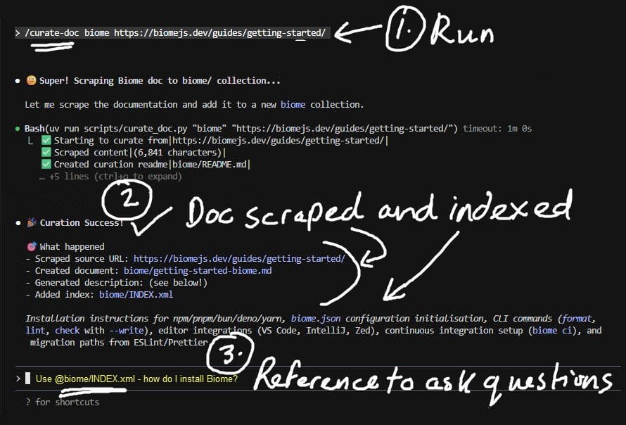 “Docs for AI” makes it easy to curate and index documentation from websites into collections. It combines python scripts with agentic capabilities to curate a new document: “/curate-doc [collection] [URL]”. Validation happens at two levels, and both are agentic: